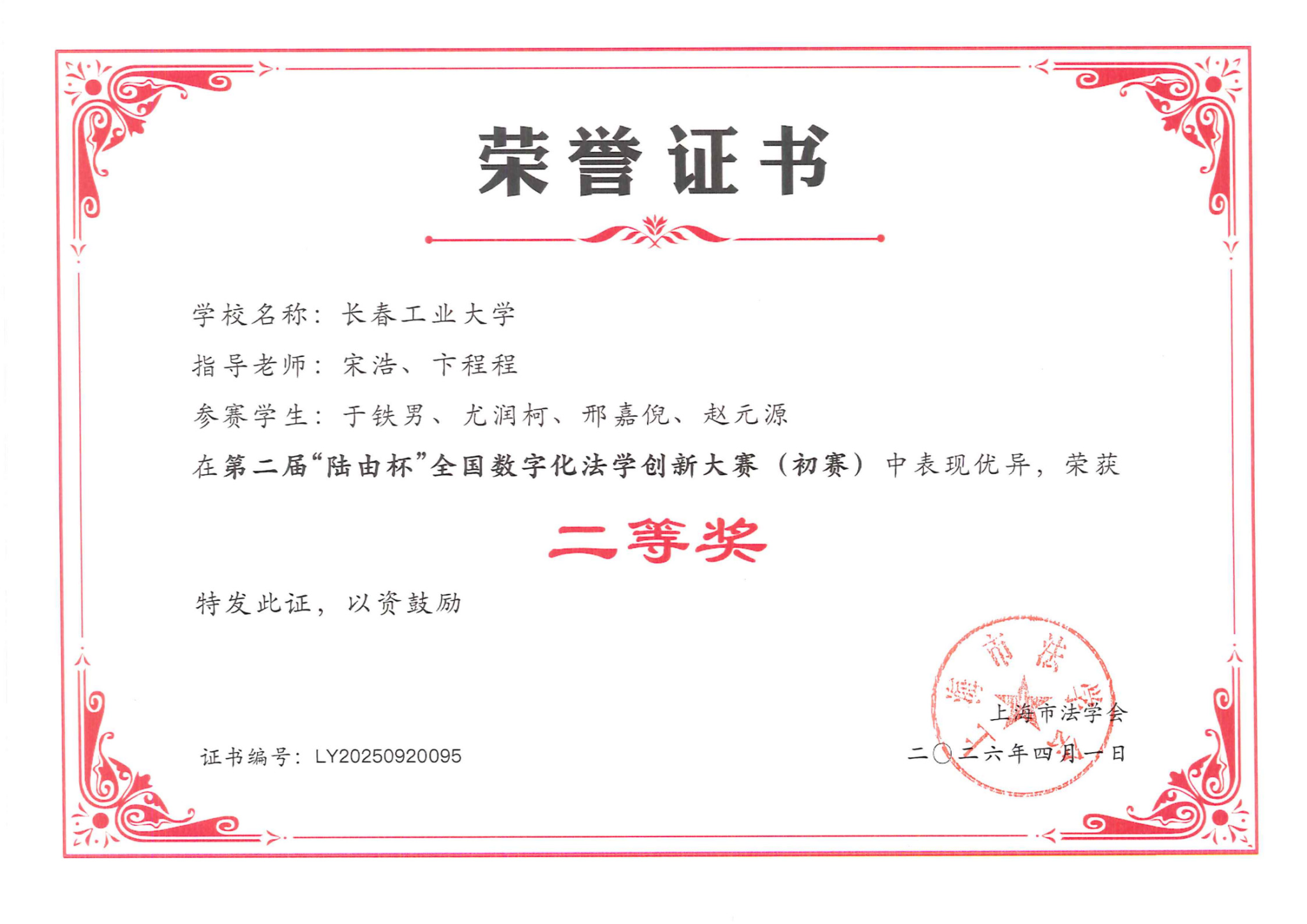 新闻网讯(通讯员 宋浩)近日,第二届“陆由杯”全国数字化法学创新大赛(初赛)圆满落幕。由学院法学专业师生组成的参赛团队,凭借出色的表现荣获二等奖,展现了学院在数字化法学教育与创新实践领域的扎实成果。