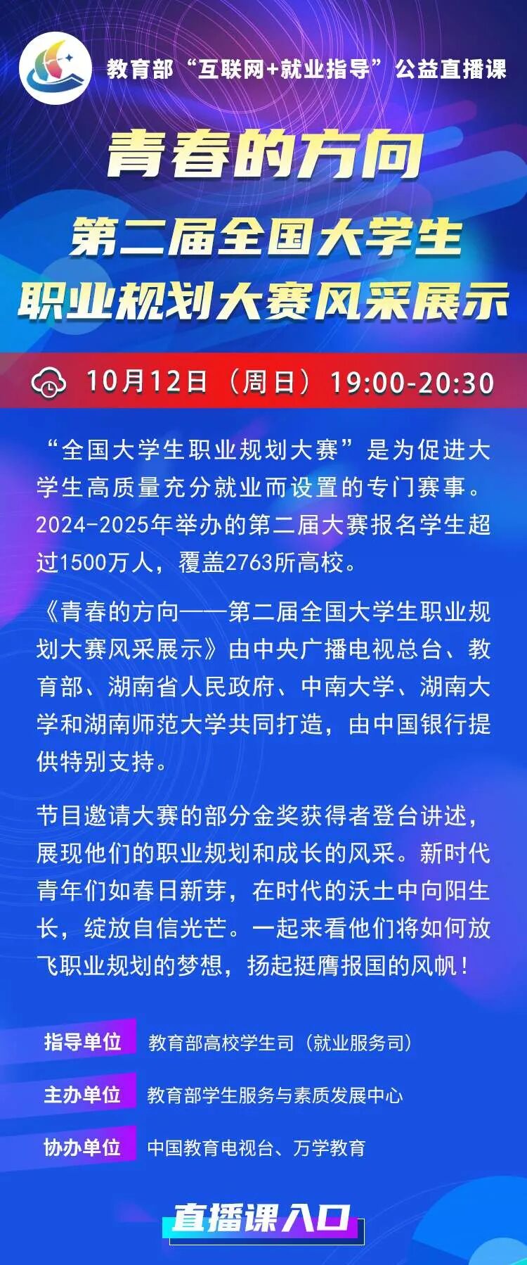 课程预告 教育部“互联网+就业指导”公益直播课: 青春的方向——第二届全国大学生职业规划大赛风采展示